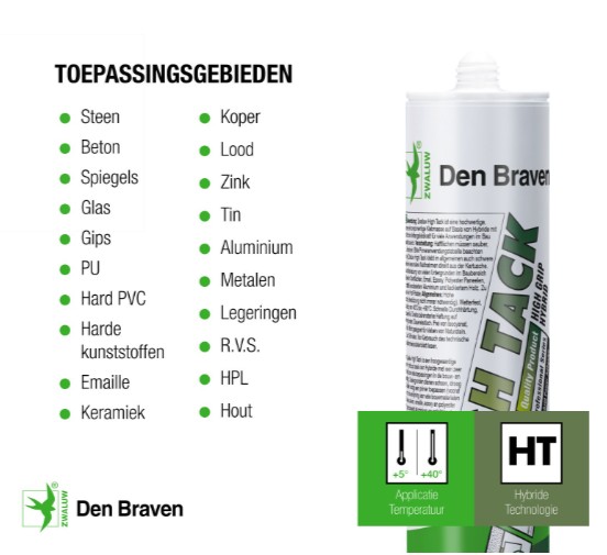 High Tack Zwaluw den Braven een hoogwaardige en professionele constructie- en montagelijm met een zeer hoge aanvangskleefkracht op basis van hybride technologie, welke onder invloed van de luchtvochtigheid uithardt tot een elastisch blijvend rubber. Is te gebruiken op vrijwel alle materialen. Indien u dit artikel los bestelt (zonder profiel/glas/spiegel) kiest u dan brief/pakketpost bij het afrekenen. Levertijd ca 1 week.