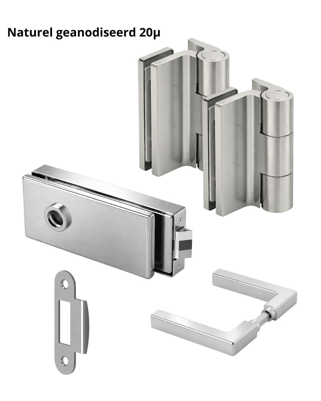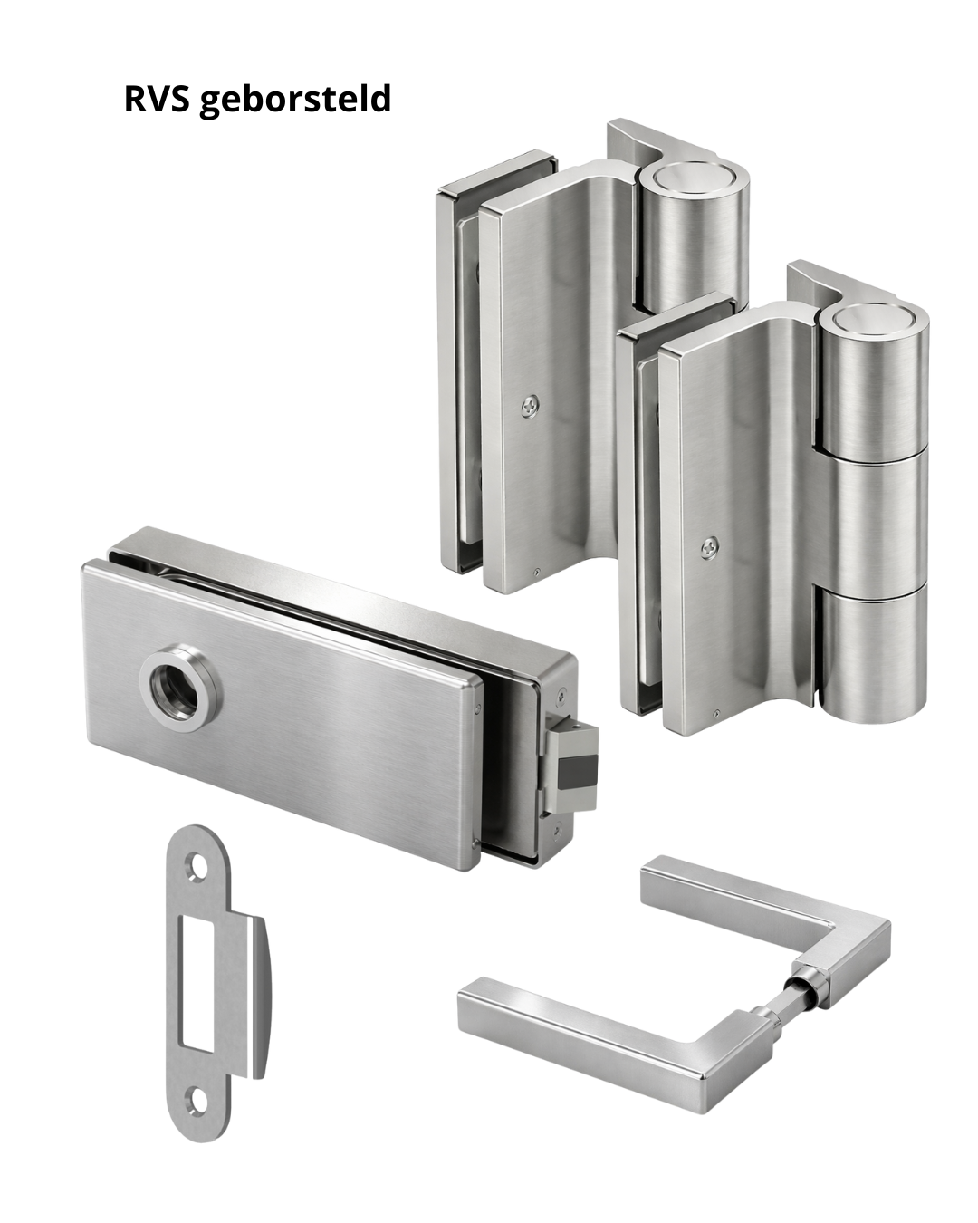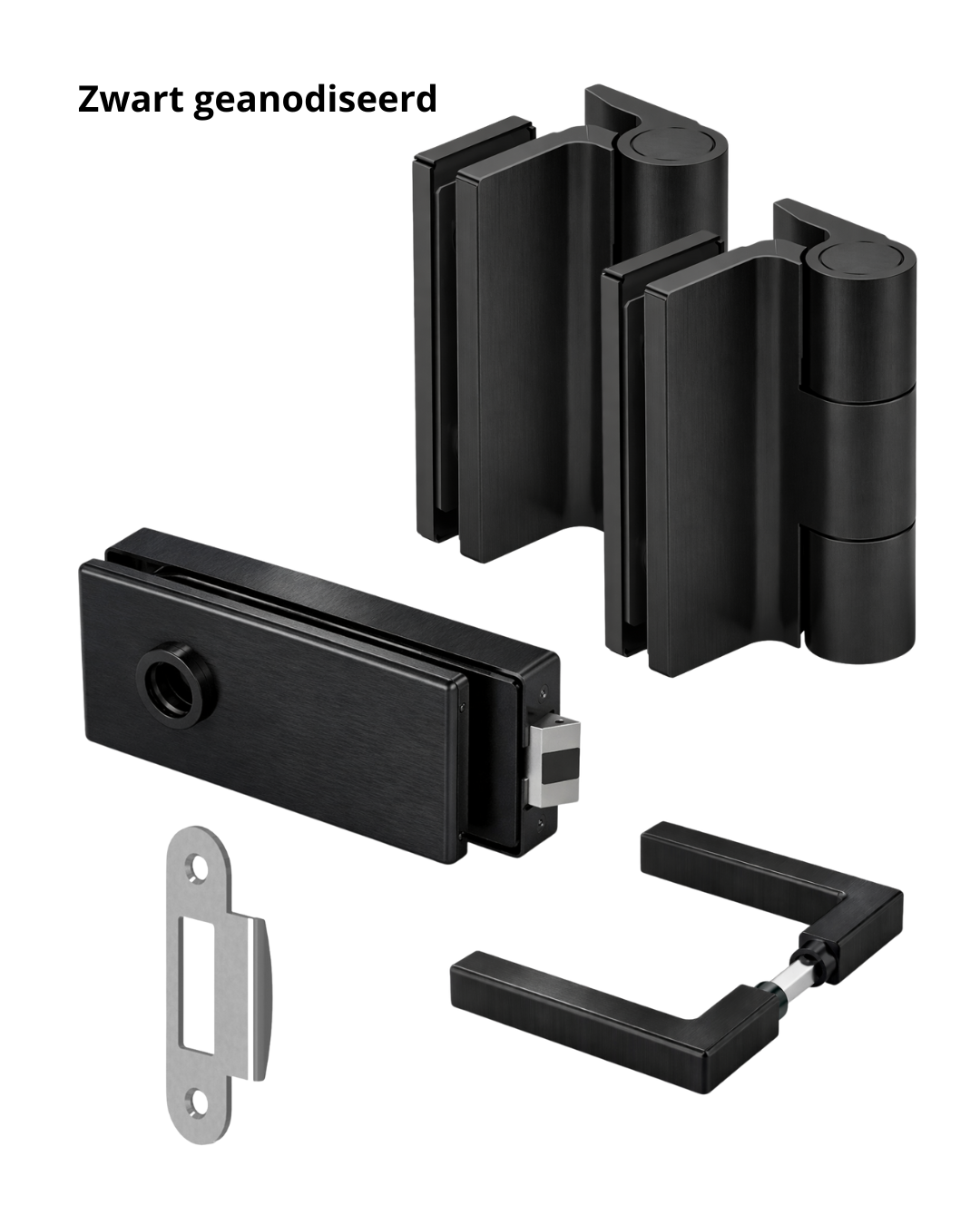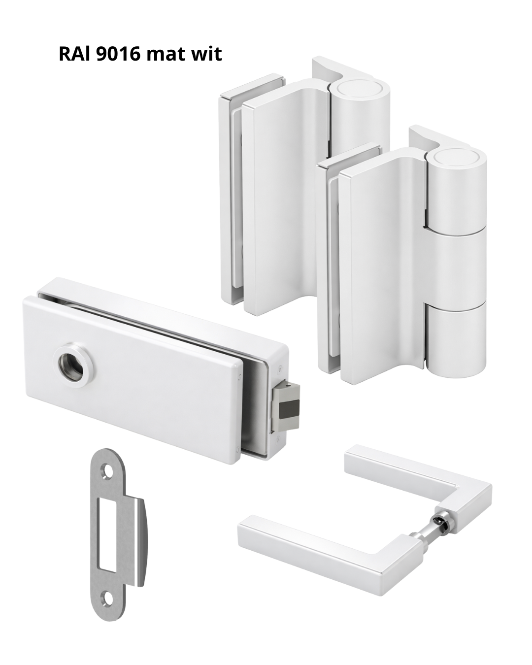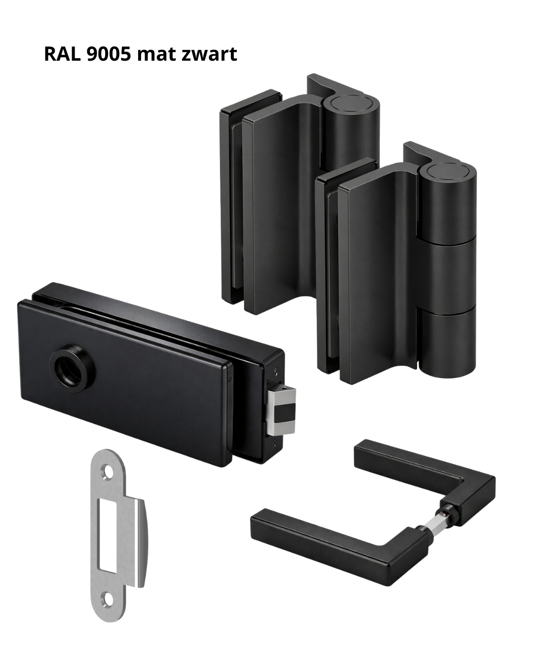 Complete beslagset voor glazen binnendeuren met aanslag. Geschikt voor glasdiktes van 8 tot 10 mm. De set bestaat uit scharnieren, deurkrukken, loopslot en slotontvanger en is bedoeld voor een strakke, moderne glasdeurtoepassing.