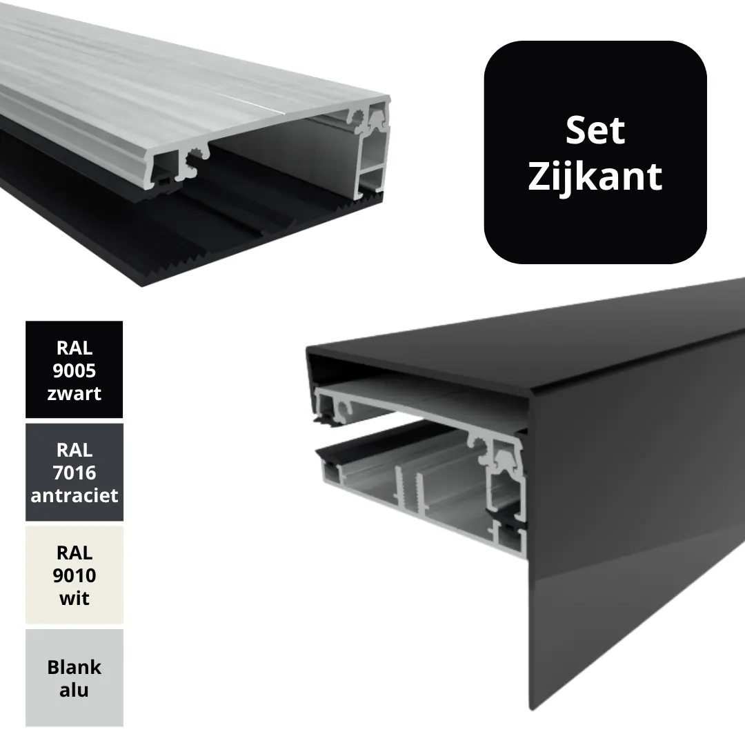 De set bestaat uit een onderprofiel met glasrubbers, een afdekprofiel met glasrubber en vullat, en een sierkliklijst met lange lip voor een nette afwerking zonder zichtbare bevestiging.