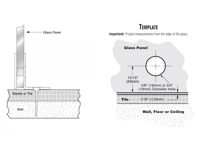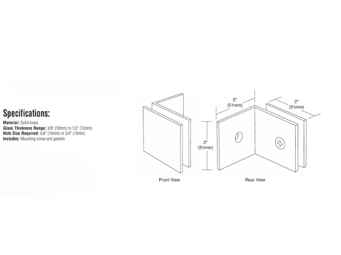De vaste paneel vierkante klem (met lange poot) wordt direct gemonteerd op de muur, het plafond of de vloer om verticale, vaste glazen panelen te bevestigen. De ruimte tussen het glas en de muur is 2 mm. Heldere siliconen kunnen worden gebruikt voor een schone, waterdichte afdichting. De 90 graden poot zorgt voor extra stevigheid. De lange steunpoot bedekt een groter tegeloppervlak.