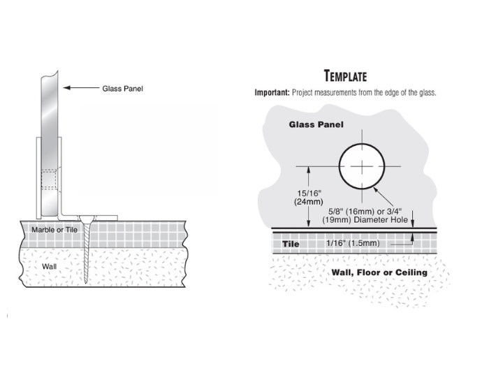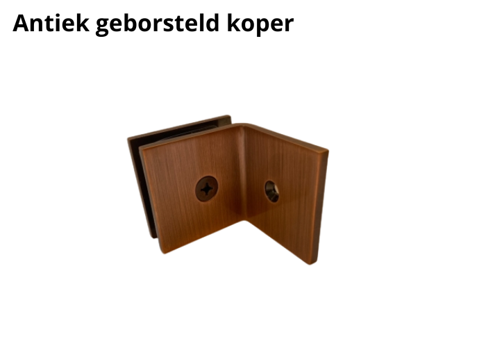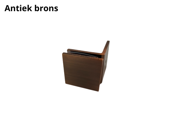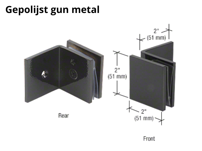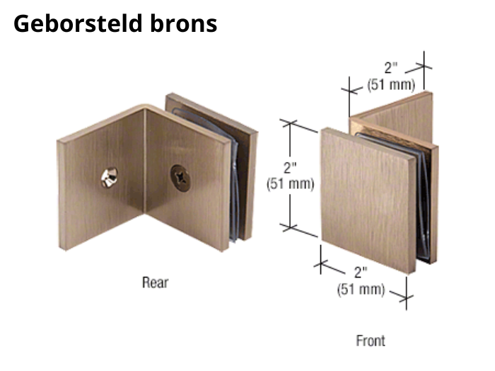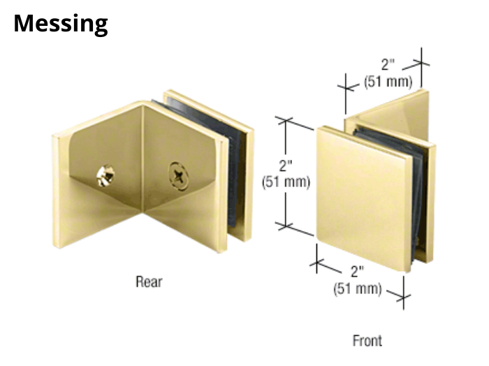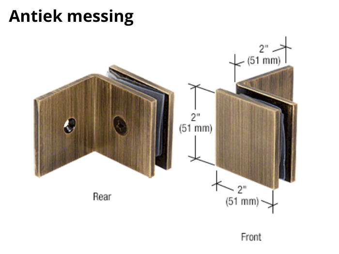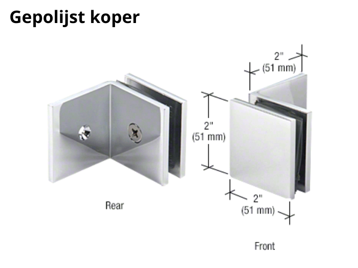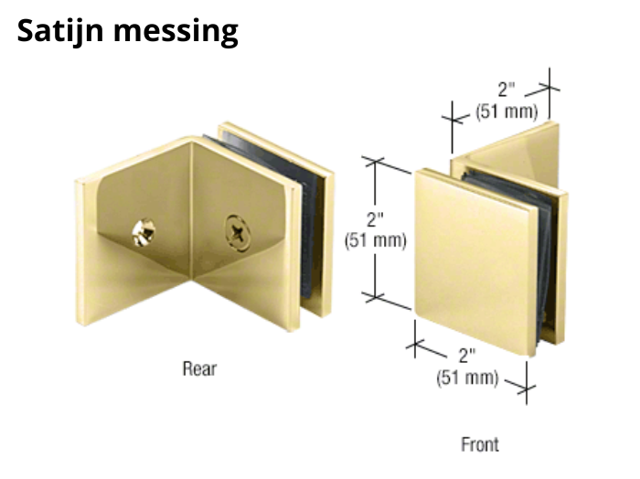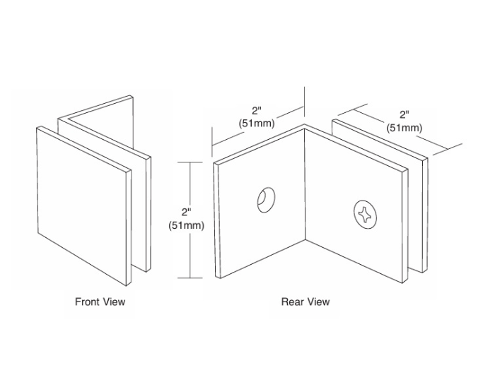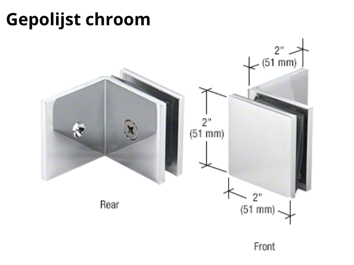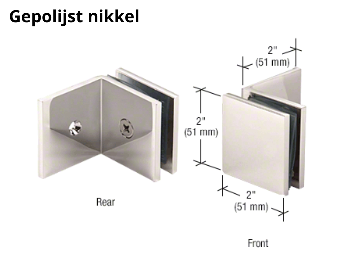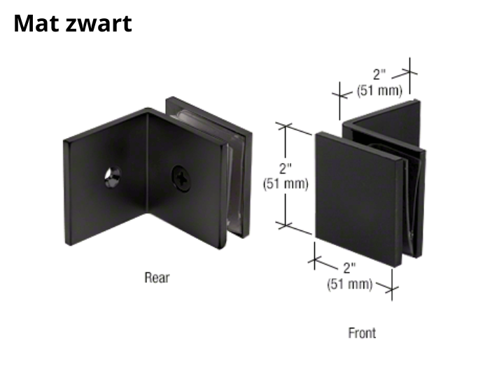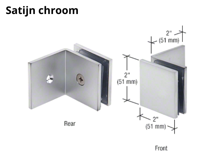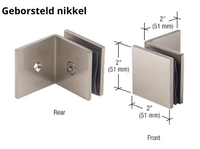 De vaste paneel vierkante klem (met lange poot) wordt direct gemonteerd op de muur, het plafond of de vloer om verticale, vaste glazen panelen te bevestigen. De ruimte tussen het glas en de muur is 2 mm. Heldere siliconen kunnen worden gebruikt voor een schone, waterdichte afdichting. De 90 graden poot zorgt voor extra stevigheid. De lange steunpoot bedekt een groter tegeloppervlak.