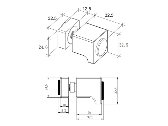 Enkelzijdige douchedeurknop vierkant 32 x 32mm met dubbelzijdige bumpers