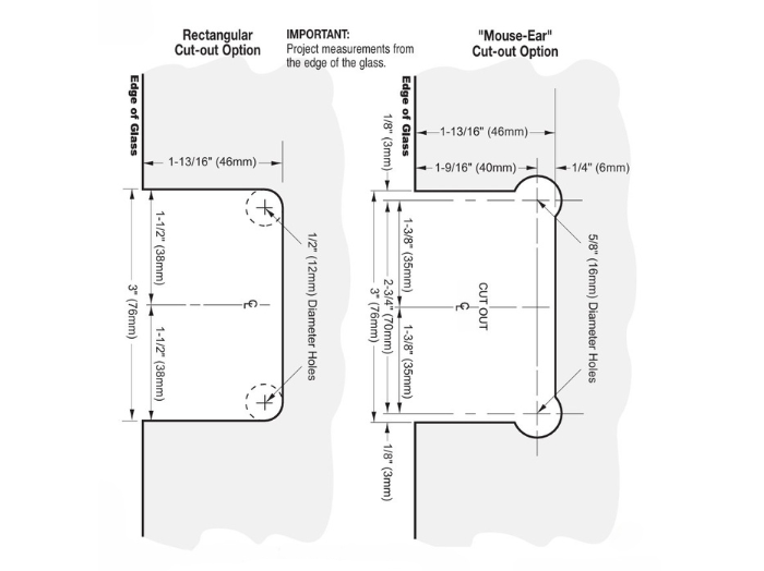 - Glasuitsparing vereist: Ja, boorgatdiameter van 12 of 16 mm. “Uitsparing vereist” betekent dat er een specifieke opening/gat in het oppervlak (bijvoorbeeld in de wand of het glas) nodig is voor de installatie van het scharnier.