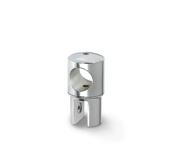 Glasverbinder met schuifopening, geschikt voor montage op een stabilisatiestang. De klem wordt geplaatst op de bovenzijde van een vast glazen zijpaneel en is vrij te positioneren over de lengte van de stang.