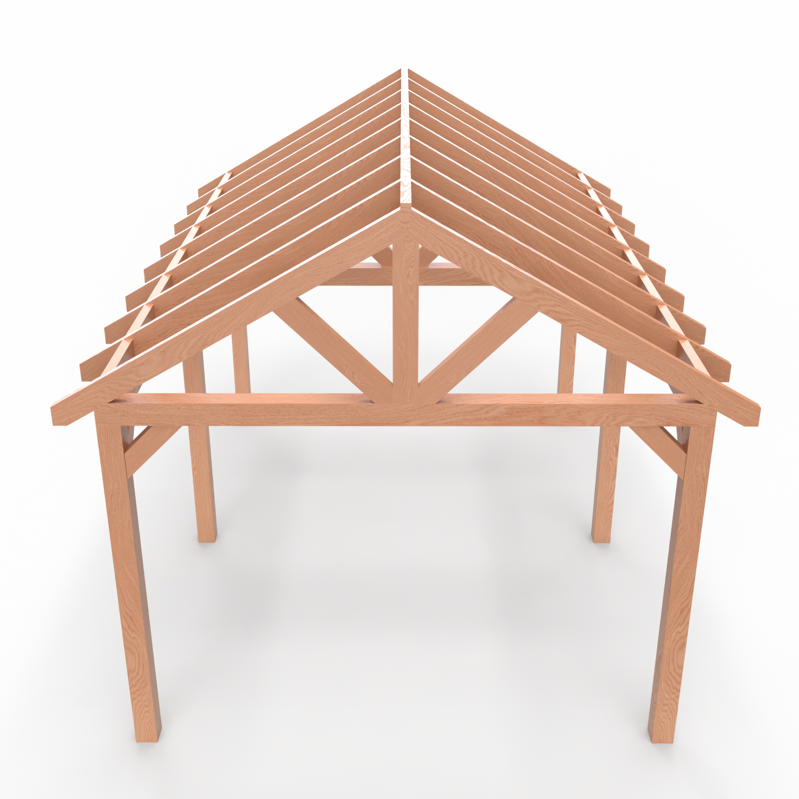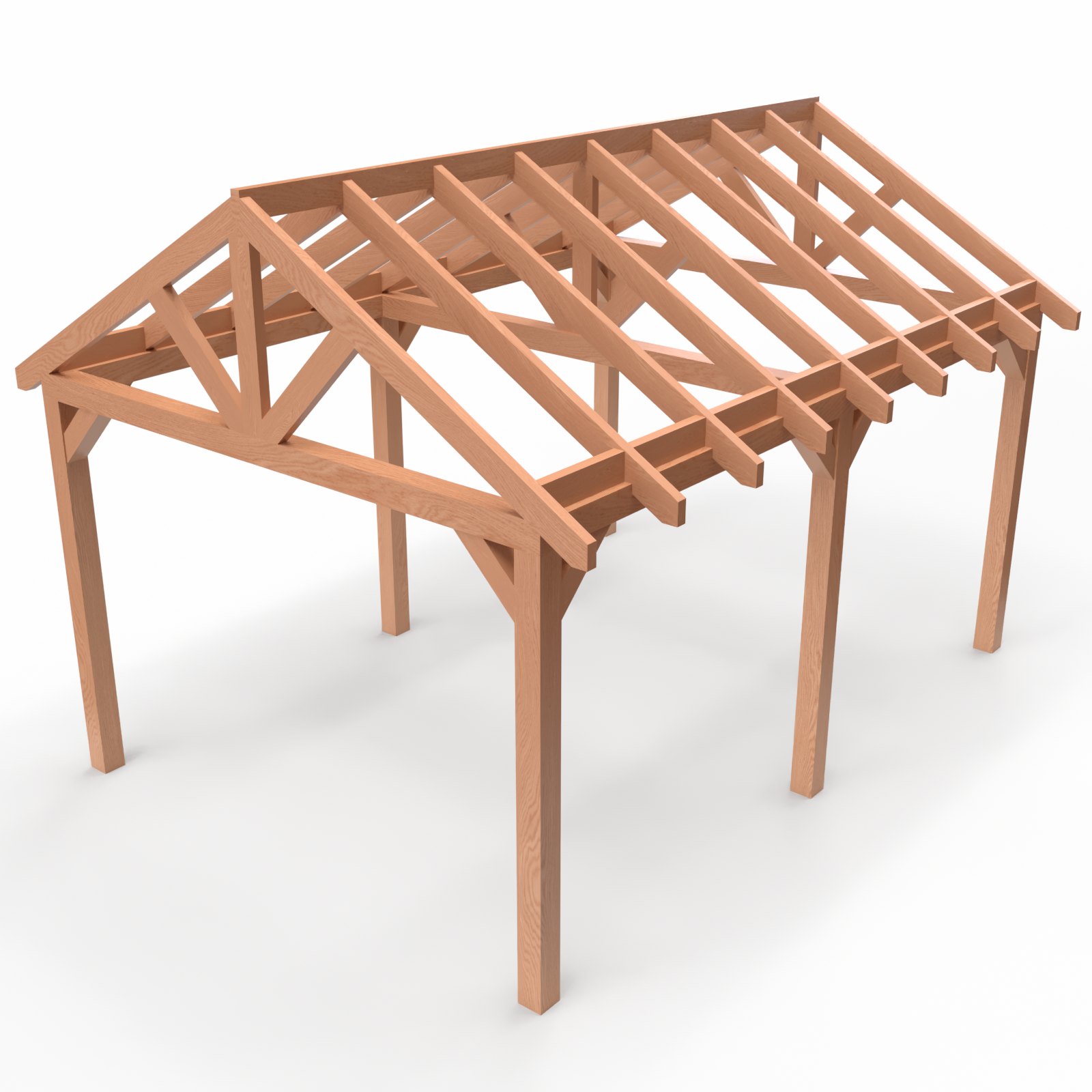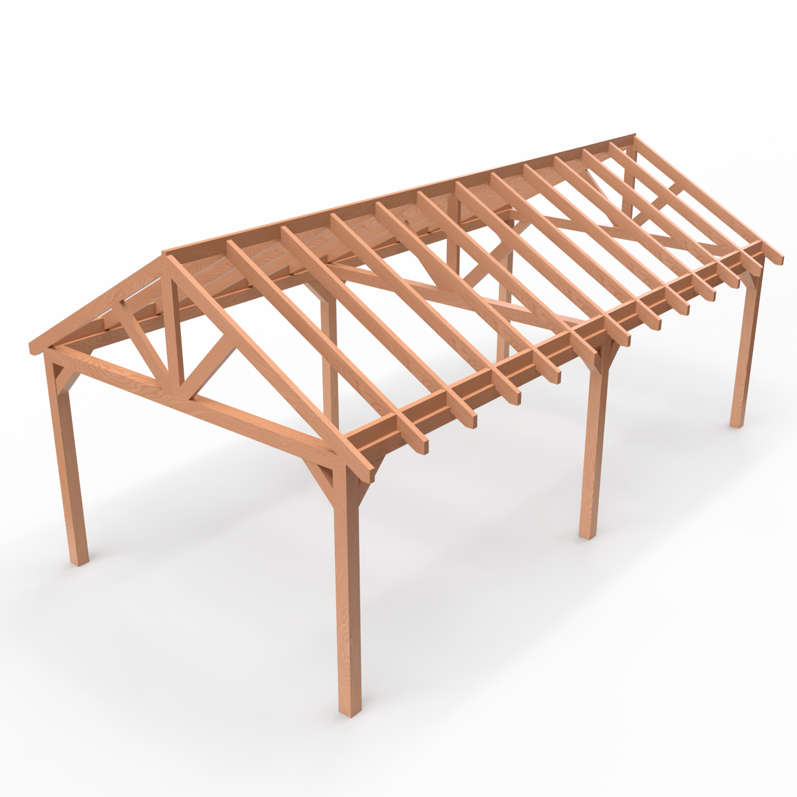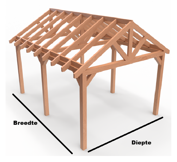 Belangrijk om te weten: dit pakket bevat alleen de houten onderconstructie. Je ontvangt de complete draagconstructie van Douglas hout, inclusief alle noodzakelijke inkepingen en het bevestigingsmateriaal voor een eenvoudige montage. Dakbedekking en zijwanden zijn niet inbegrepen, zodat je volledige vrijheid hebt om je overkapping af te werken zoals jij dat wilt. Onze experts adviseren je graag over de mogelijkheden voor de fundering.