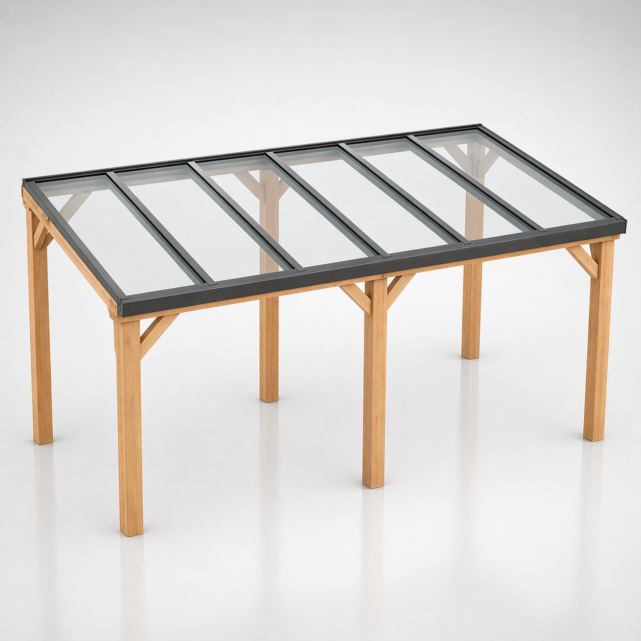 Veranda vrijstaand met glazen dak – Douglas duplo 14cm hout – incl. aluminium klemprofiel en Sierkliklijst -DD50GV